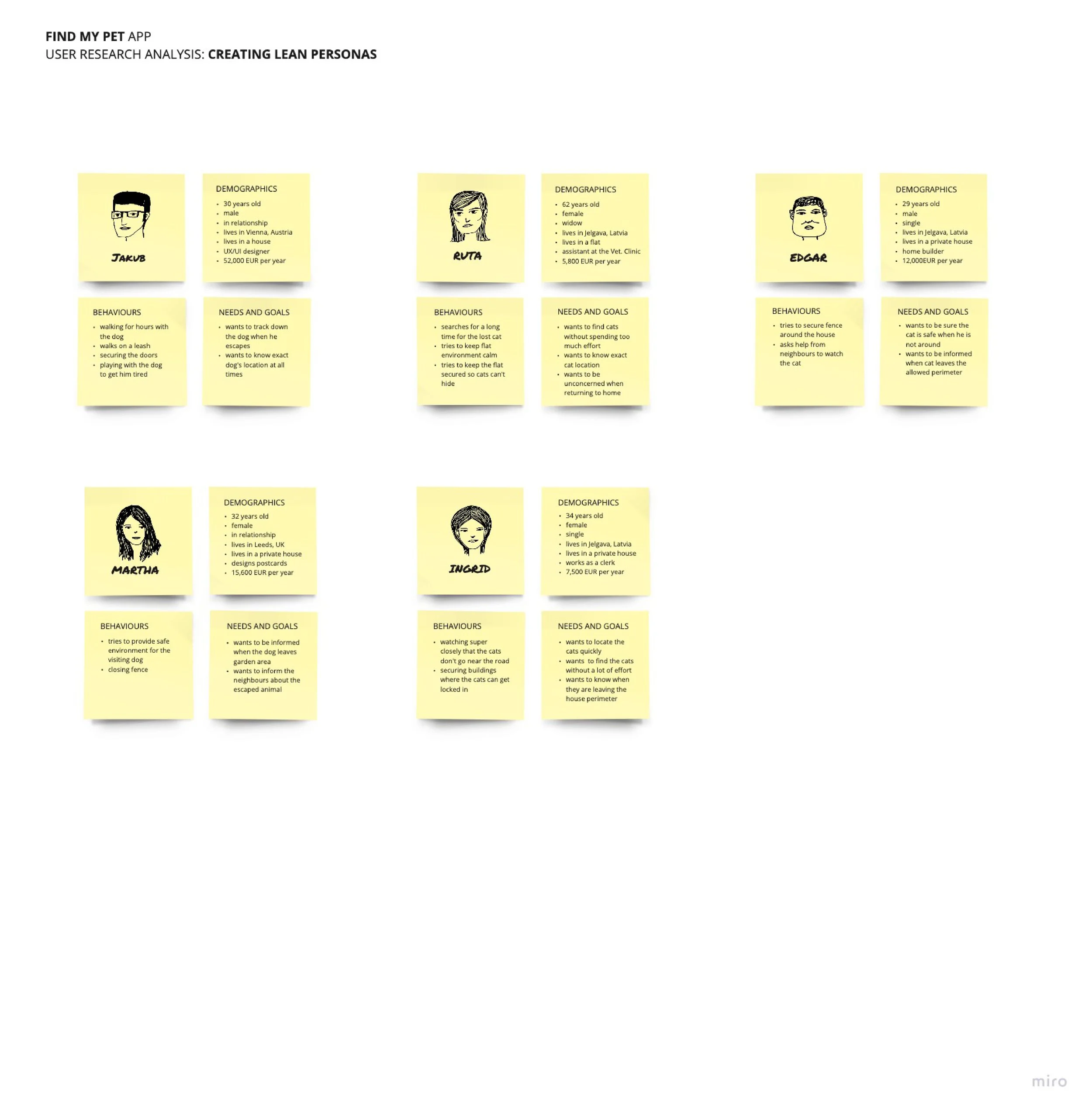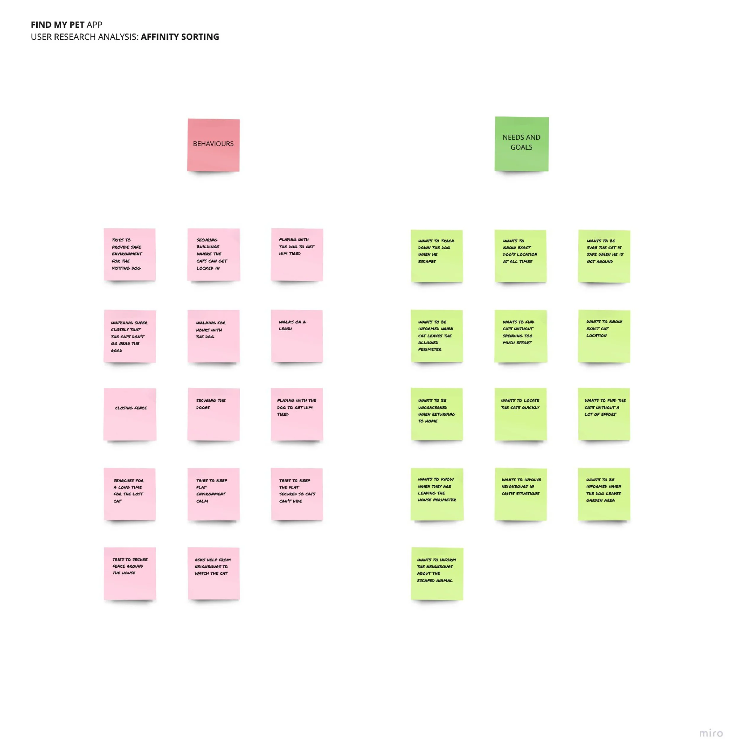 Extensive user research — including user stories, affinity mapping, user personas, lean personas, and Red Route analysis — revealed a consistent set of needs that guided every major feature decision. Together, these insights shaped an experience optimised for high-stress, time-critical situations such as lost-pet emergencies.