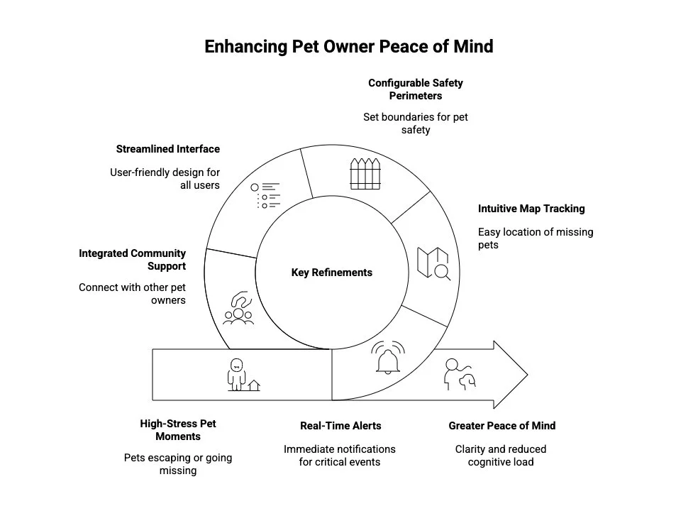 The Design process was grounded in user research and iterative testing, with a focus on high-stress moments such as pets escaping or going missing. Key refinements included real-time alert flows, intuitive map-based tracking, configurable safety perimeters, a streamlined interface for varying tech comfort levels, and integrated community support features—all aimed at enhancing clarity, reducing cognitive load, and delivering greater peace of mind for pet owners.