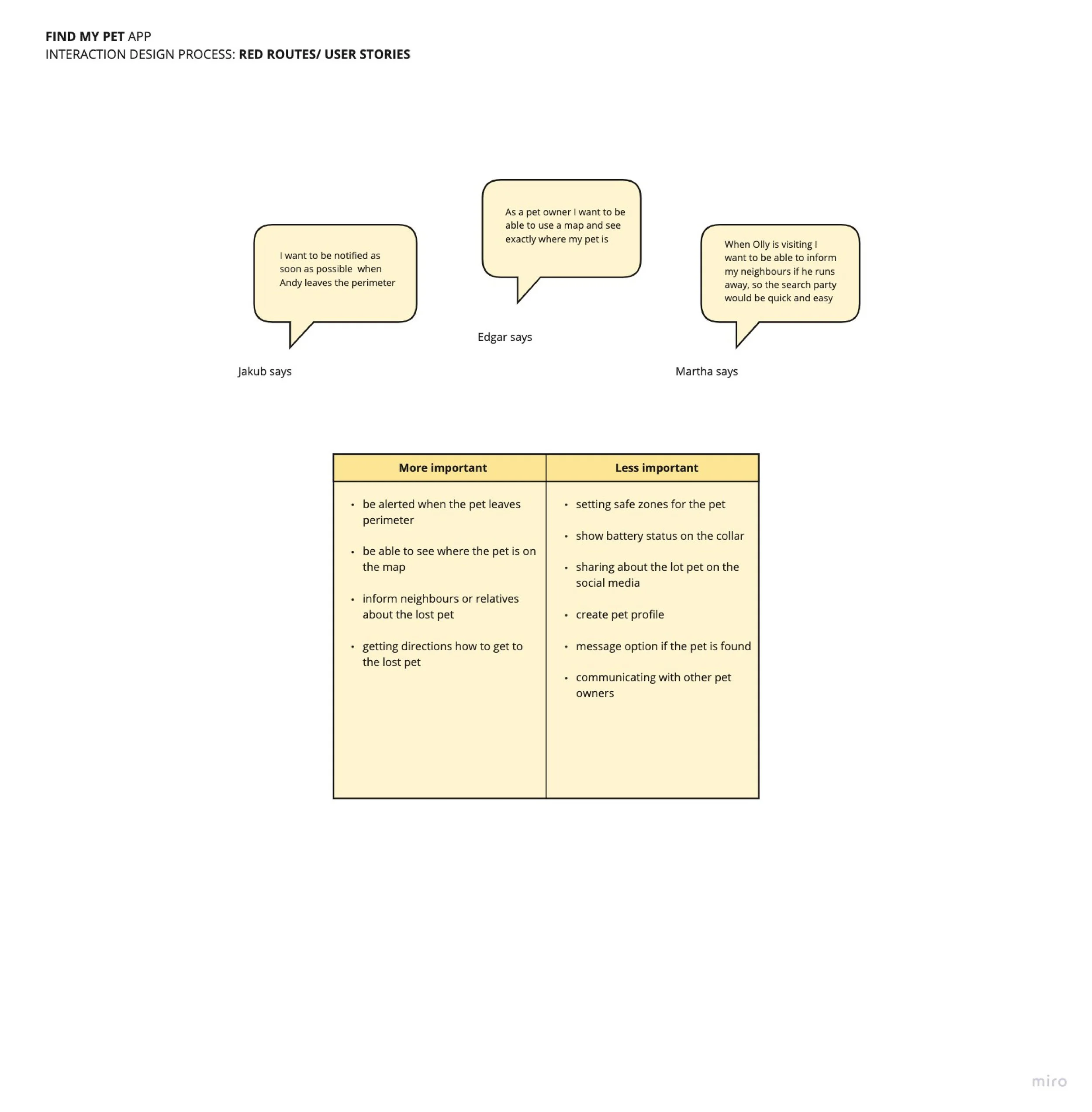 Why: To translate research into actionable, outcome-focused requirements from the user’s perspective (e.g., "As a pet owner, I want to get a real-time alert if my pet leaves a safe zone, so I can take immediate action.").