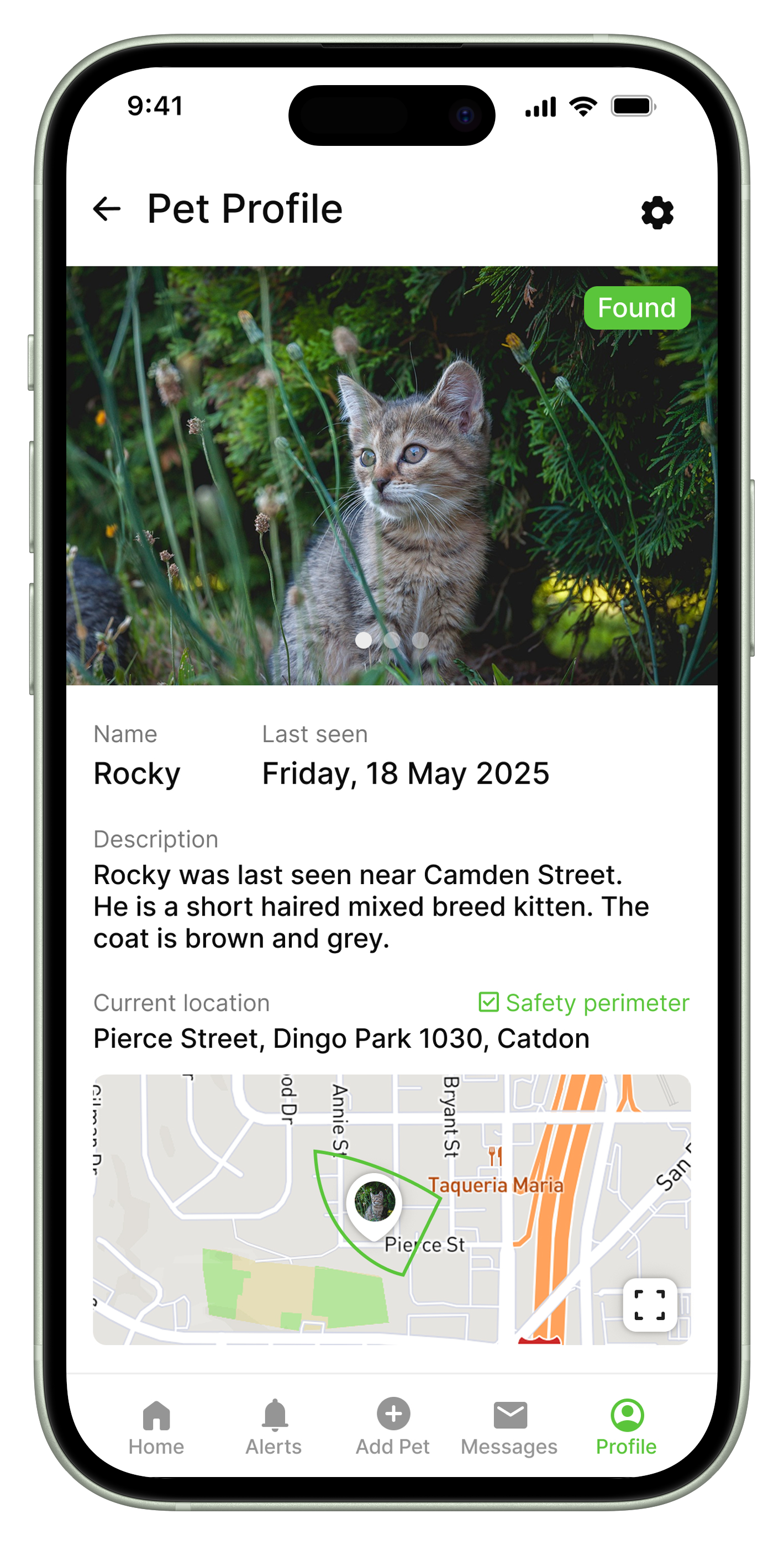 Iteration: Added a distinct “Pet Found” indication on the pet profile to resolve the lost/found status.